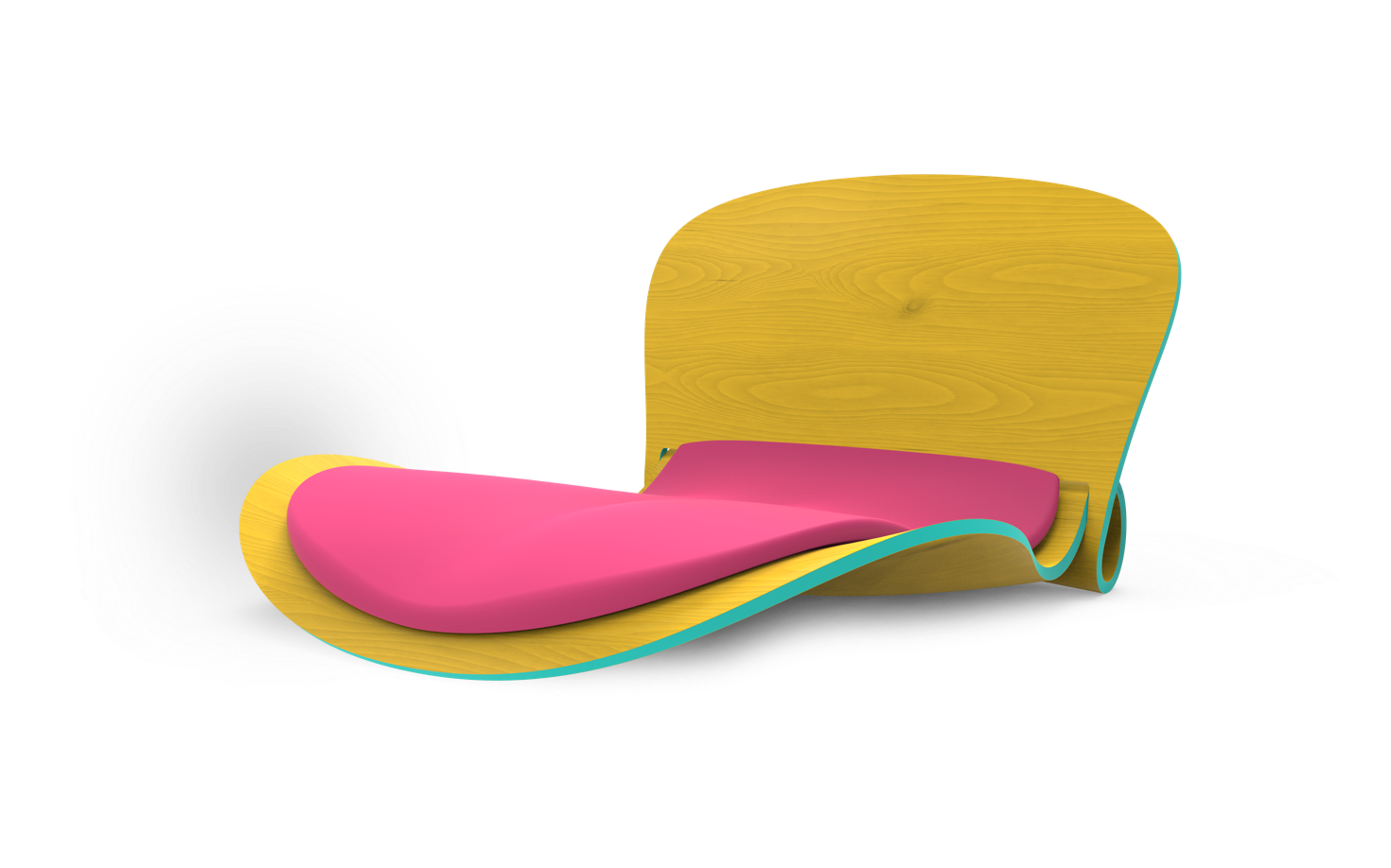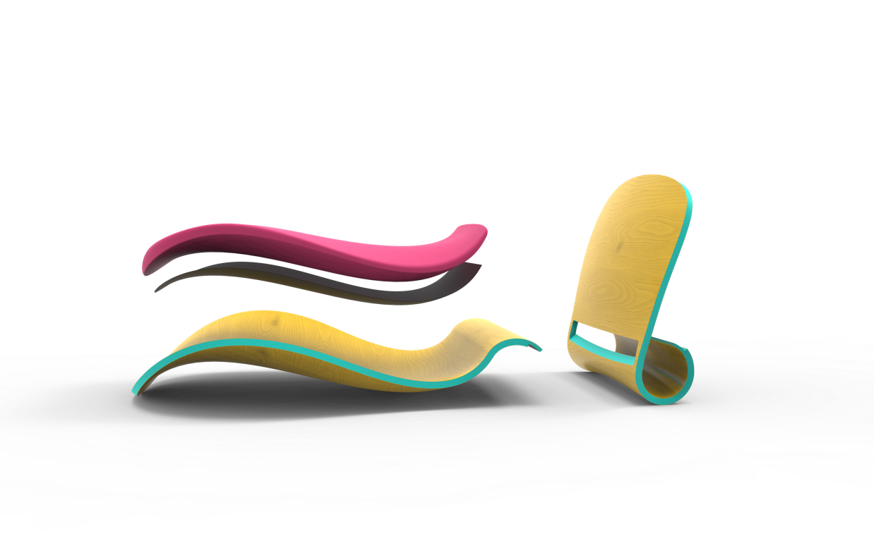 The final chair consists of four pieces. The seat and the backrest is molded, CNC-cut and painted plywood. The two parts are glued together in an angle that supports stability to withstand the weight forces that are put on the parts. The cushion is upholstered and could be manufactured from a sustainable material like Agroprene. It’s not fixed a the seat. Instead a rubber matt provides the needed friction the hold it in place.